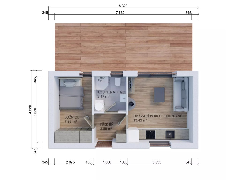 Cena neobsahuje žaluzie, kuchyňskou linku ani žádný jiný nábytek.